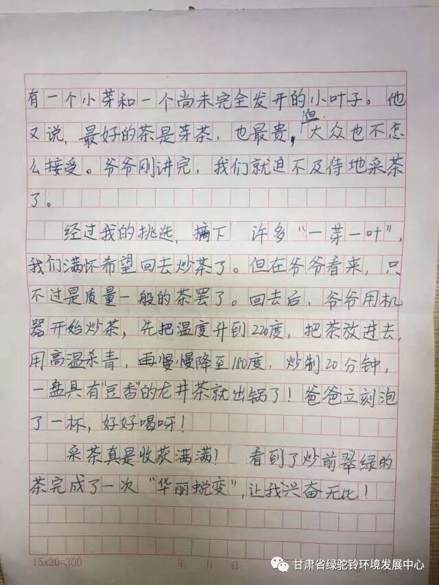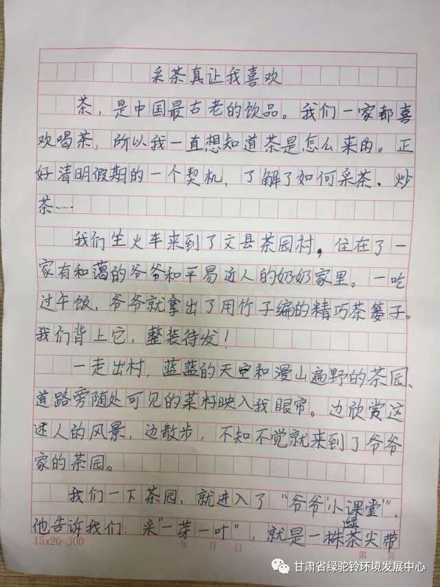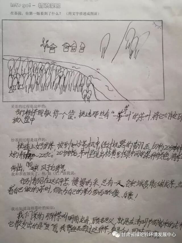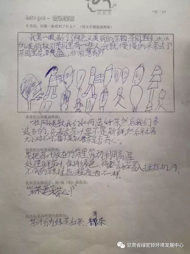 2017 年,绿驼铃又回到了茶园村,关注这里的中国大鲵(俗称“娃娃鱼”)保护工作。2018 年4 月5-7日,绿驼铃组织游客共计46 人在甘肃省文县白龙江流域的中庙镇茶园村开展自然体验和生态旅游。目的是鼓励村民发展生态有机茶叶种植及销售,减少环境破坏,增加社区居民经济收入,更好的激励社区居民参与大鲵和生态环境保护。本次活动历时三天,以家庭为单位,开展大鲵保护现状的调查以及对大鲵历史分布区域社区居民的问卷调查,穿插其他的活动内容包括采茶、炒茶、户外体验、自然和户外游戏、茶园小学环境宣教、社区环境宣传教育活动以及“512”地震10 周年纪念活动。
