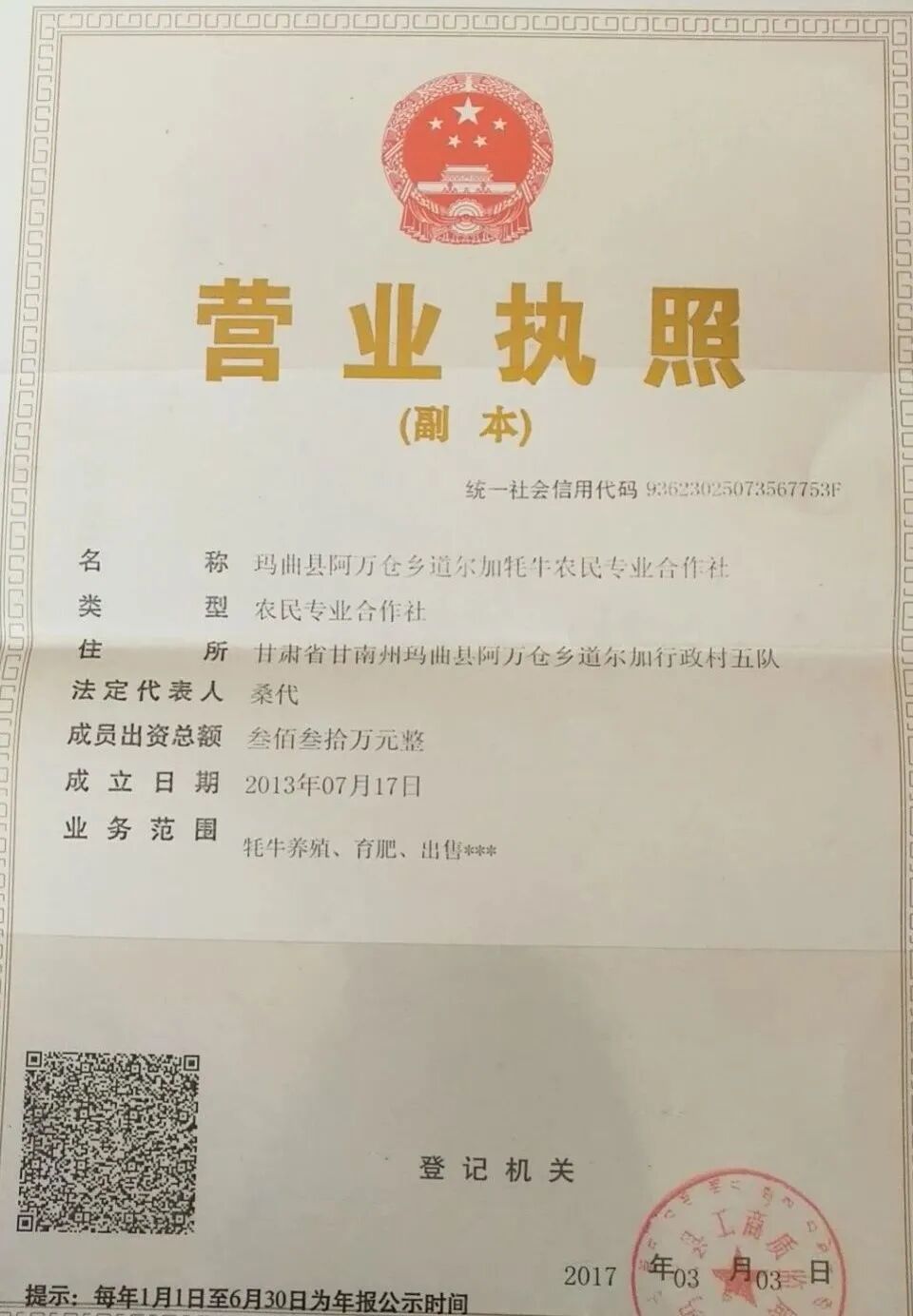 图/玛曲县阿万仓乡道尔加牦牛农民专业合作社营业执照