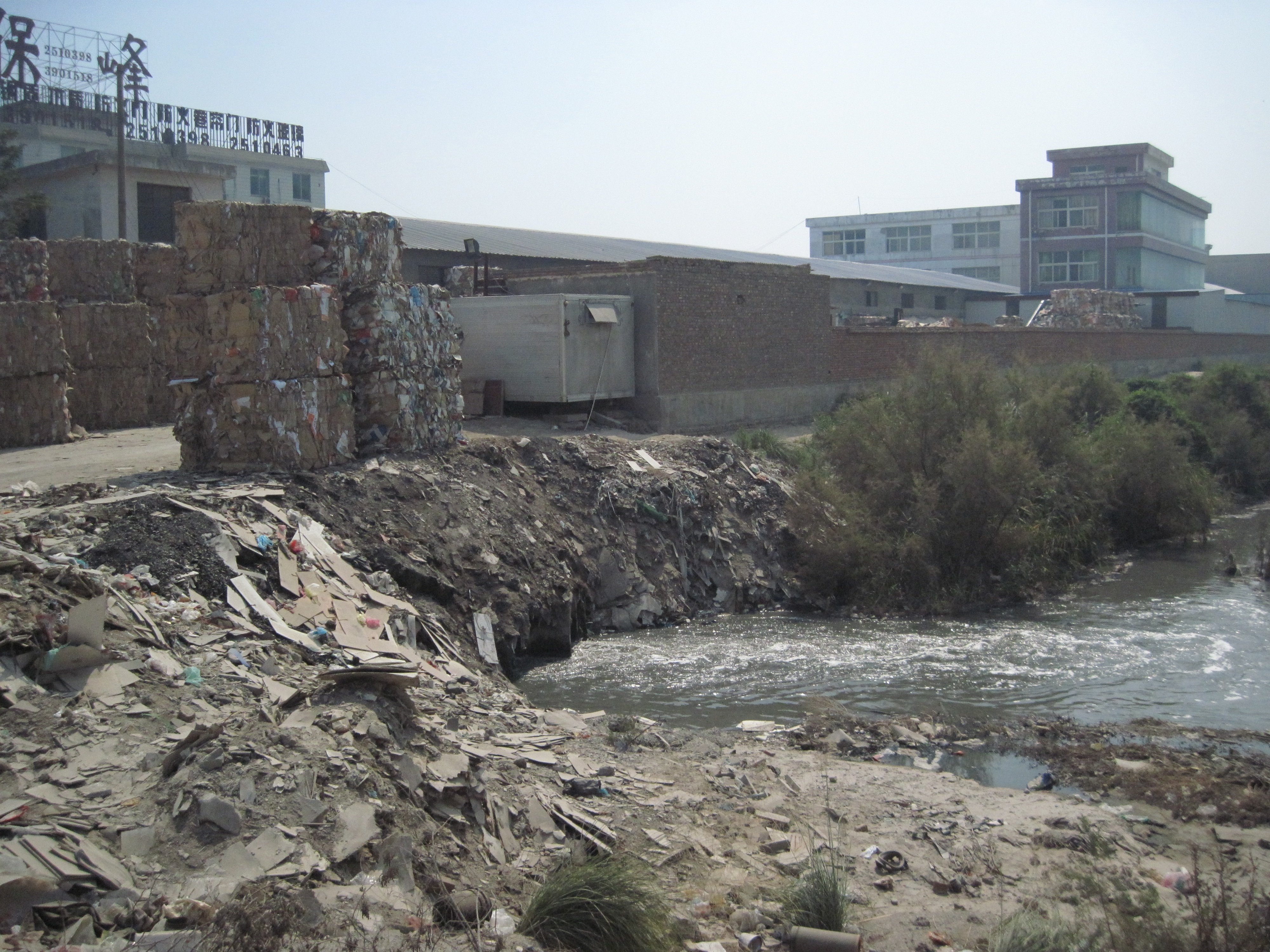 Driving quickly through narrow mud walls and down alleyways to snap pictures of mountains of trash, electronics, and the polluted tributary, we finally get to a field just half a kilometer from the power plant. Our guide shows us a small trickle of filthy water. Here, he says, is where the polluted water begins its eastward journey. We suspect that the original source is somewhere close to this, but that the company probably has it well guarded, or more likely still, houses have been built over the pipes so that they literally ‘vanish’ from the visual landscape.